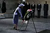 Dronning Margrethe og kronprins Frederik besøger Neue Wache som er et mindesmærke for ofre for fascisme og militarisme, hvor de deltager i kranselægning. Kransen lægges ved en kopi af Käthe Kollwitz's statue 'Moder med død søn', der er placeret inde i bygningen.Mads Claus Rasmussen/Ritzau Scanpix